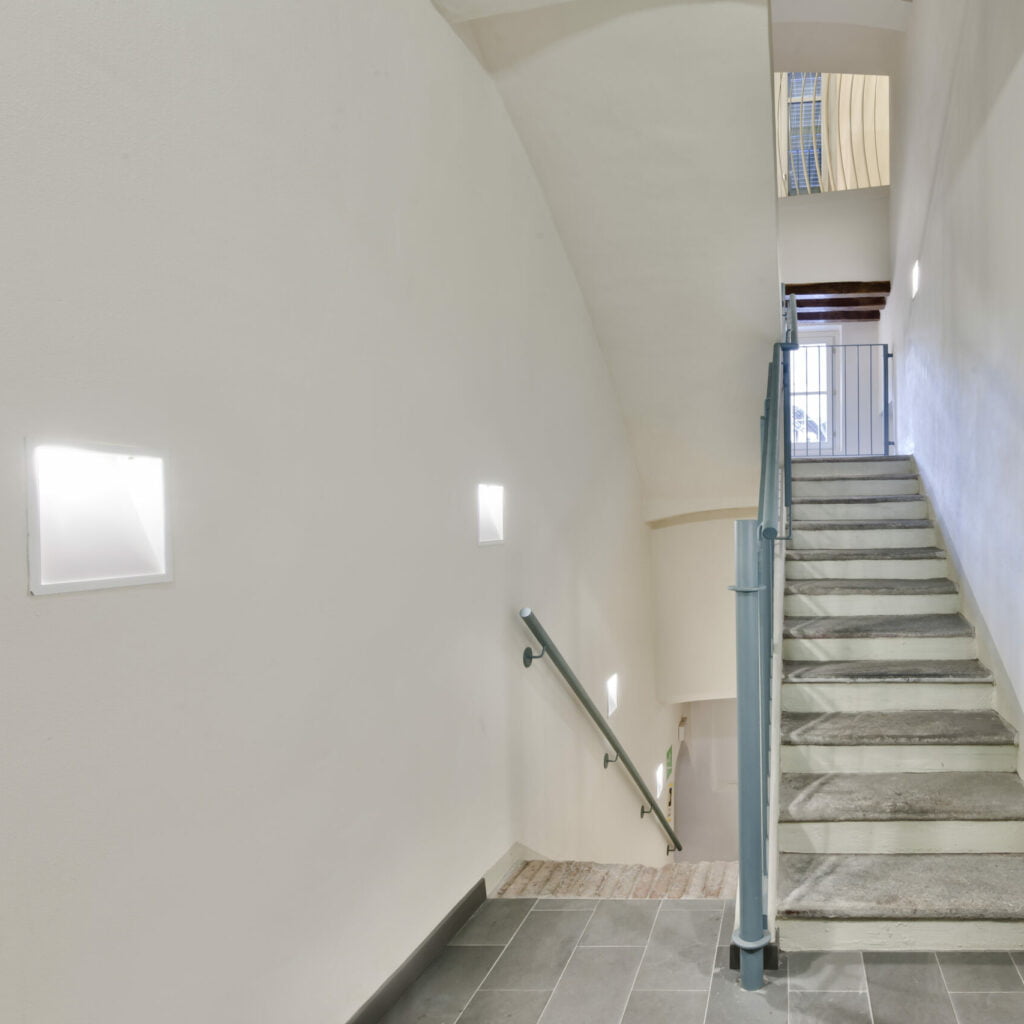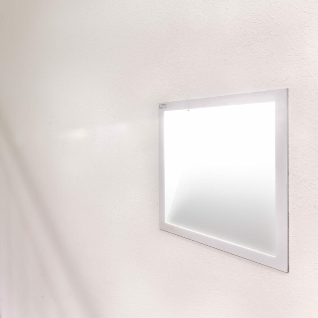 Indoor wall/ceiling recessed fixture, direct or indirect light.Metal body and mechanical parts in steel, metal painted frame, protection diffuser in tempered glass.Wiring for halogen lamp, fluorescent lamp and metal halide lamp with electronic and electromagnetic ballast.By request version with form for concrete wall and ceiling, high efficiency pre-anodized aluminium kit reflector, by request emergency wiring kit.