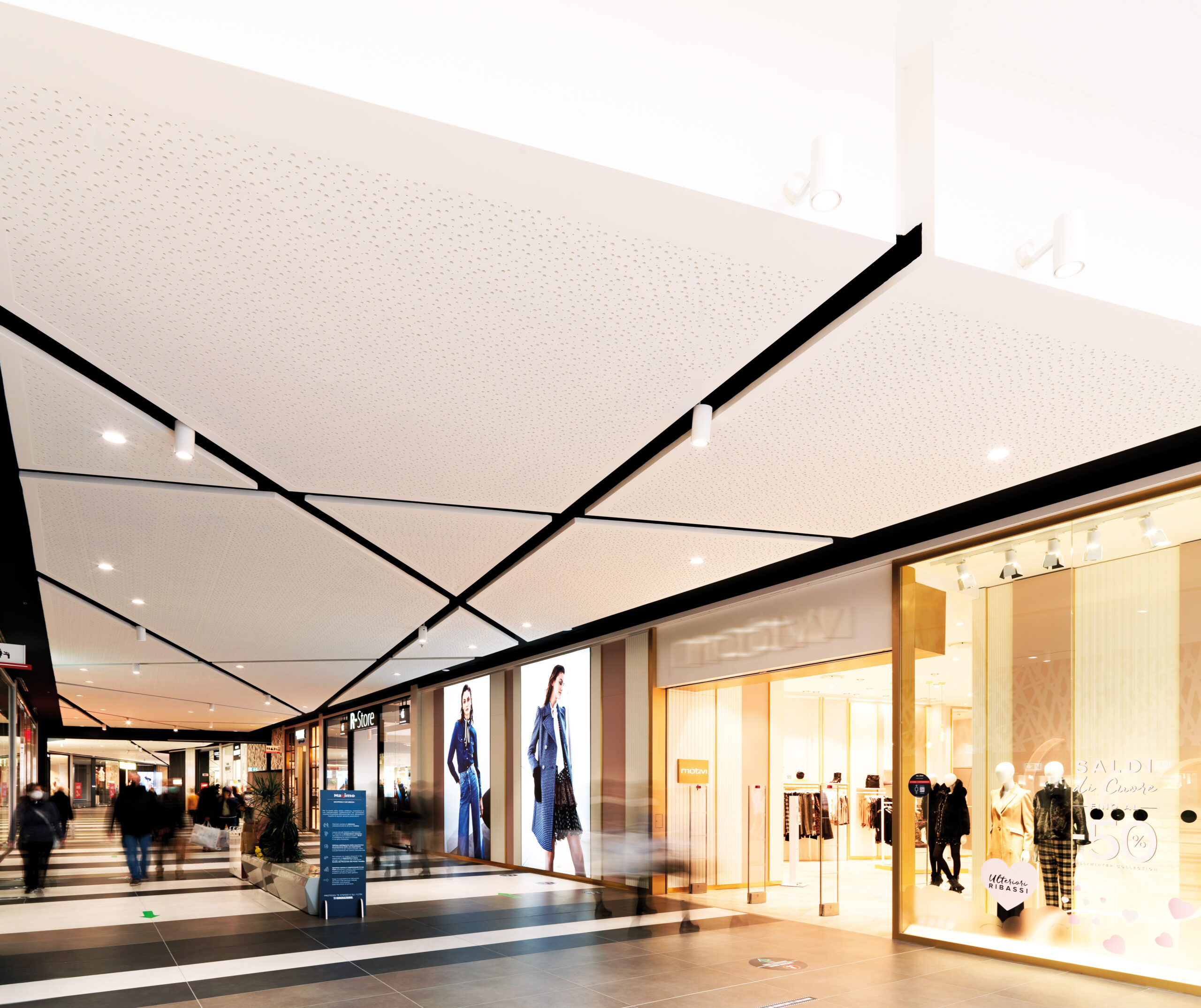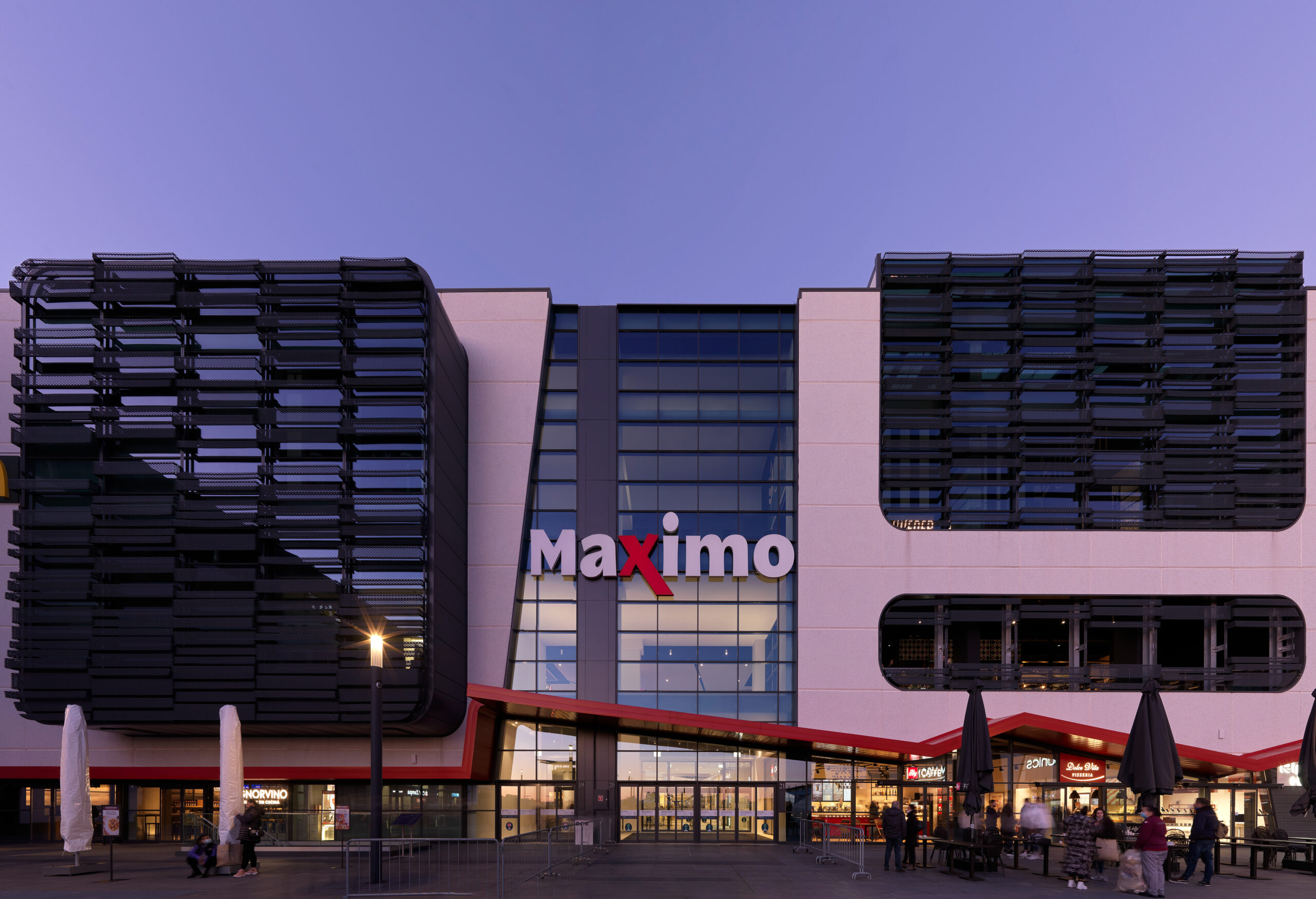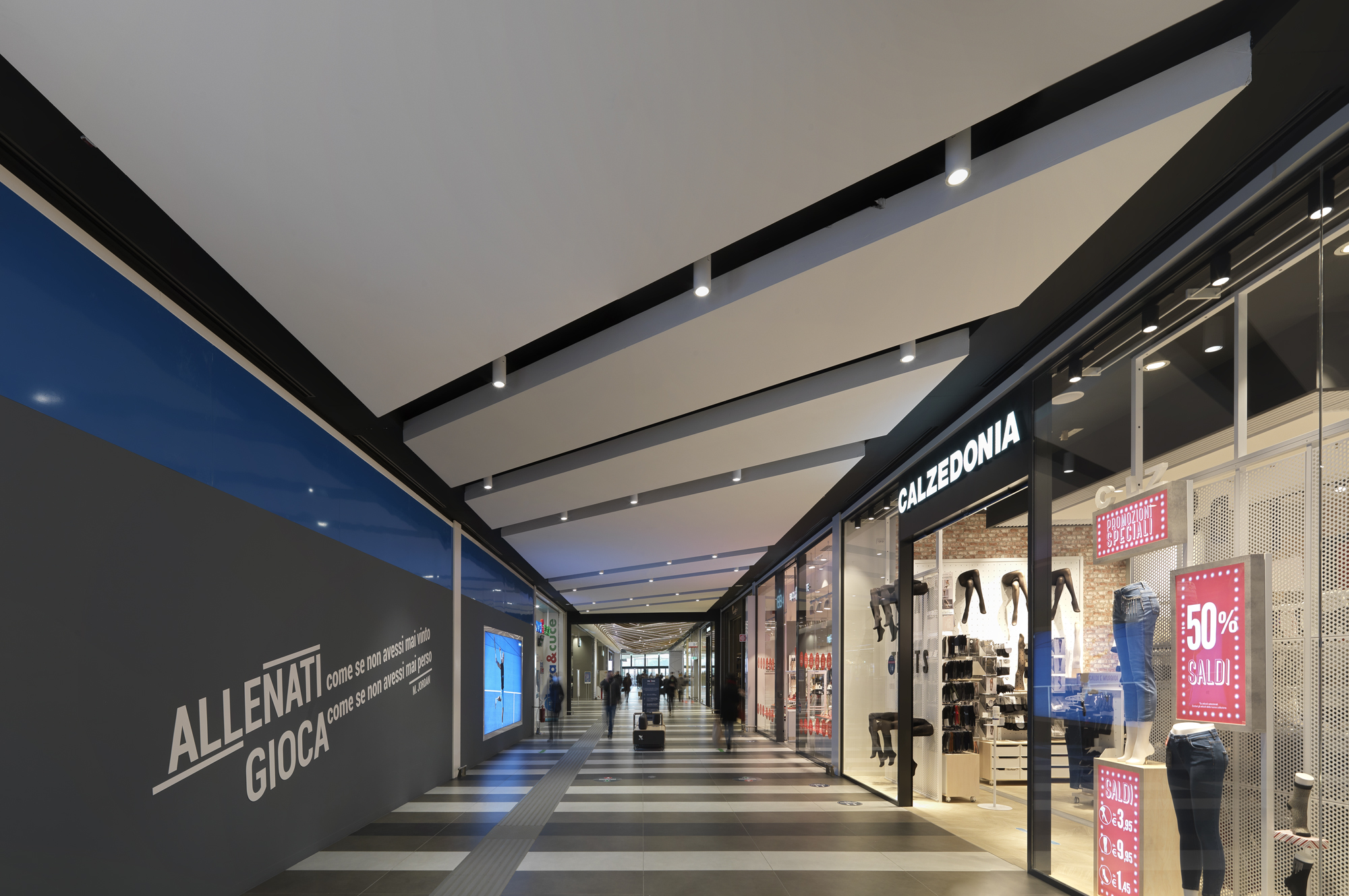 Maximo is an iconic project, located in a densely populated neighborhood in the urban area of Rome. A multi-storey structure, with large galleries, a commercial offer that includes multiplex cinemas, the latest generation gym, leisure facilities as well as a food court and garden food with fast and traditional catering formulas. This is combined with a diversified and exclusive shopping offer. 65,000 m2, 160 units, 1 hypermarket, 12 specialized medium-sized areas, over 40 bars and restaurants, luxe multiplexes, gym, games room, 3 floors. The Twenty7 LED series fixtures installed on the very high ceiling beams ensure general, targeted and diffused lighting. Adjustable luminaires were chosen to contrast the inclination of the ceiling planes and allow the right pointing to the required areas and situations, at the same time allowing penetration down to the lower floors. In the areas of the corridors and galleries, within a suggestive geometric effect, Semplice projectors are used, now in the version with base, now mounted on a track according to need, while Nyx recessed luminaires are positioned along the perimeter walkway in the fixed LED version which integrate the general lighting close to the spaces of the individual brands. The flush recessed File profiles and Minifile in the wall version were used in the car park entrance areas.
