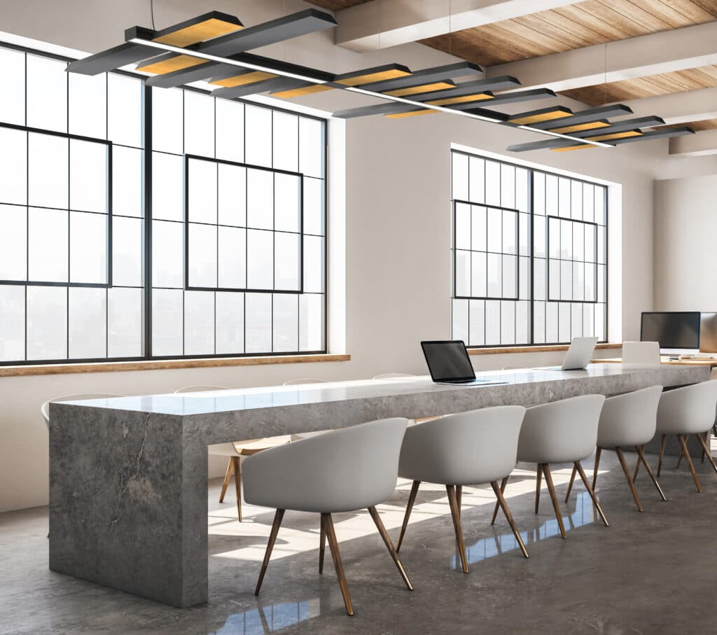 Sistema modulare, in estruso di alluminio 98x48mm, a sospensione o su binario trifase elettrificato da completare con gli accessori dedicati necessari. Finitura verniciata testurizzata. Schermi per luce diffusa in policarbonato opalino, ottiche professionali con diverse aperture del fascio ed equipaggiabile, all’occorrenza, con pannelli fonoassorbenti in diversi colori e materiali. Grado di protezione IP40