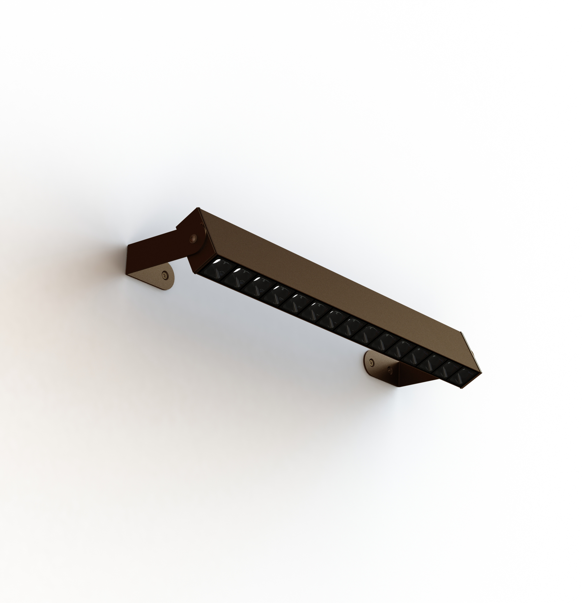 Apparecchio da esterno di misura 470 mm. E’ costituito da un profilo di estruso di alluminio rettangolare, corpo dell’apparecchio, al cui interno sono alloggiati in fila di 15 gruppi ottici – composti di LED professionale chip on board 2,2W , lente e housing antiabbagliamento UGR<14 - permettendo quindi di raggiungere flussi luminosi molto elevati. Ottiche spot, flood, wide e Asymmetric.… leggi tutto