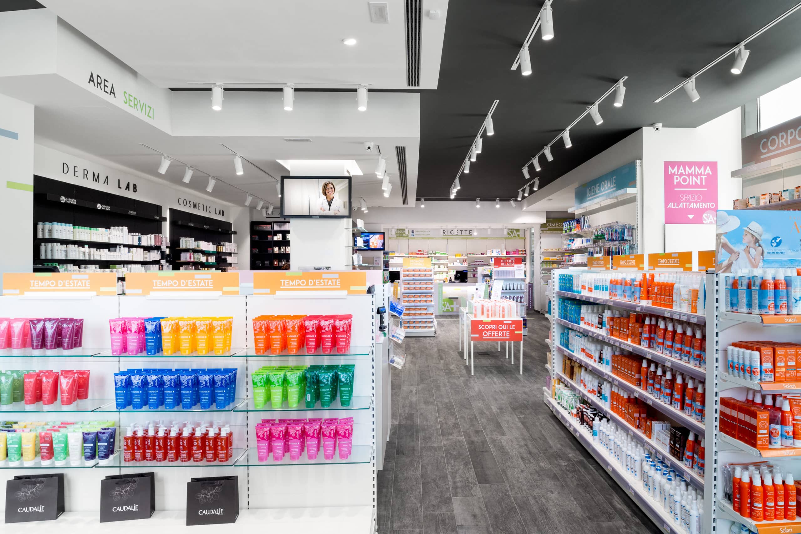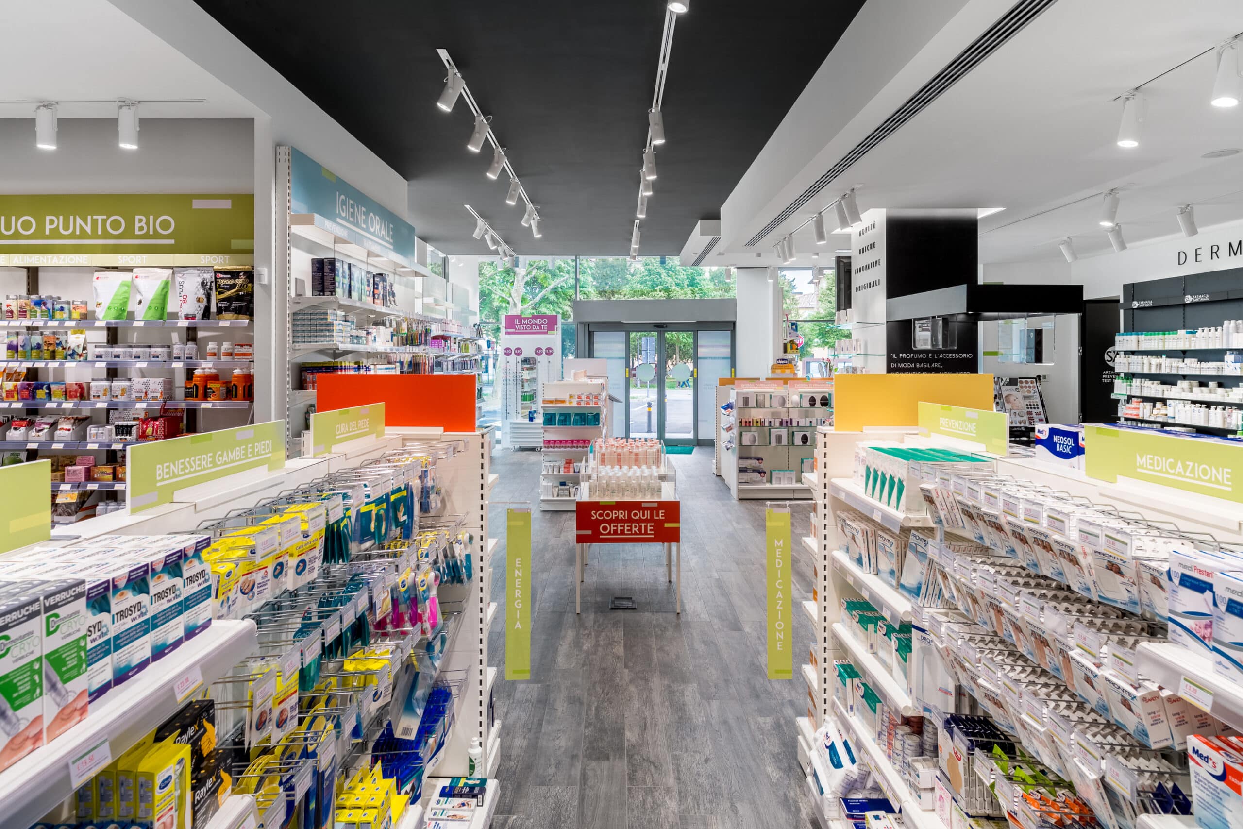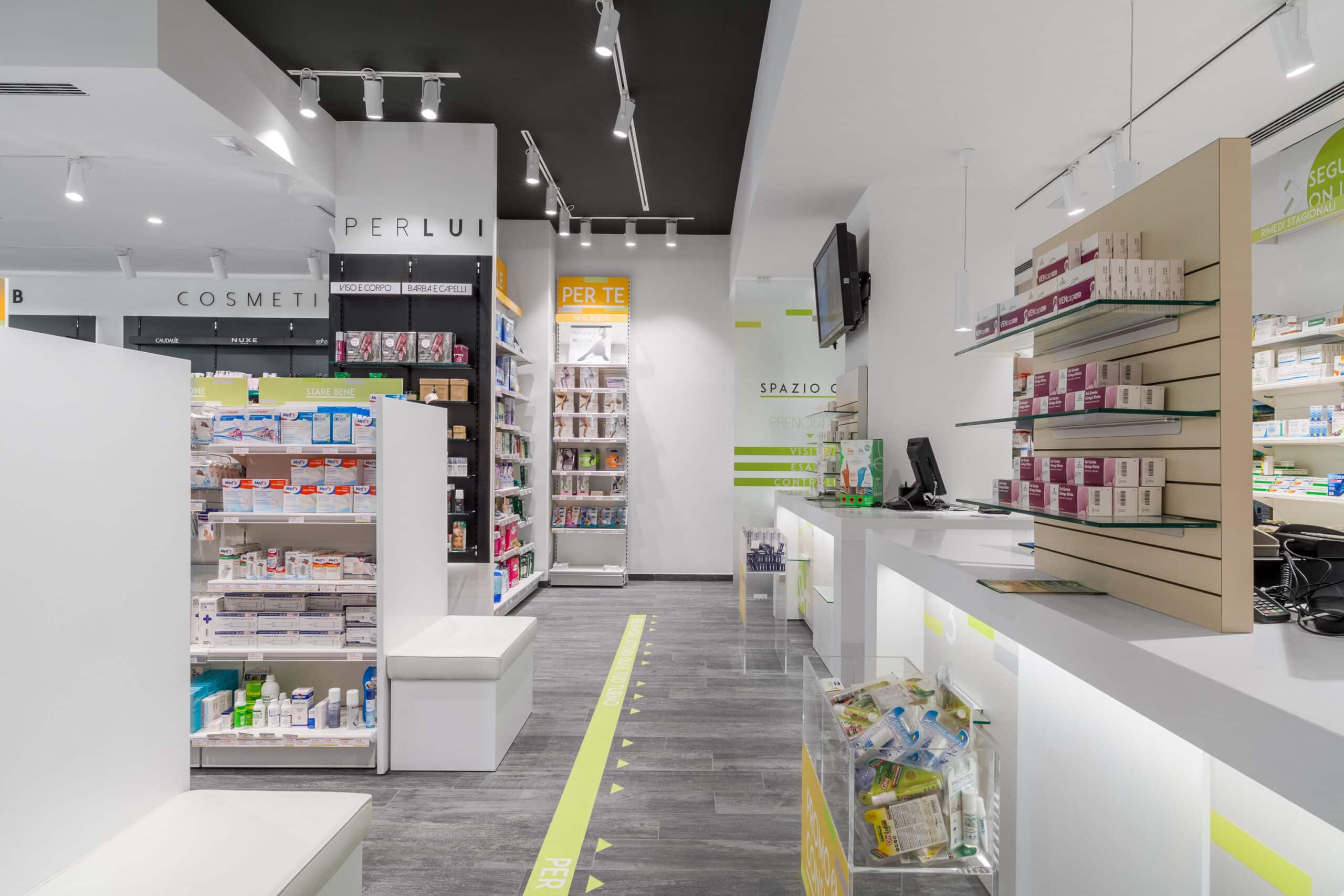 La comunicazione e gli arredi su misura, guardano ad un design ricercato ed internazionale; le vetrine caratterizzate dall’alternanza tra elementi luminosi, leggeri e scorci dello spazio vendita della farmacia, danno risalto alla grande facciata vetrata.