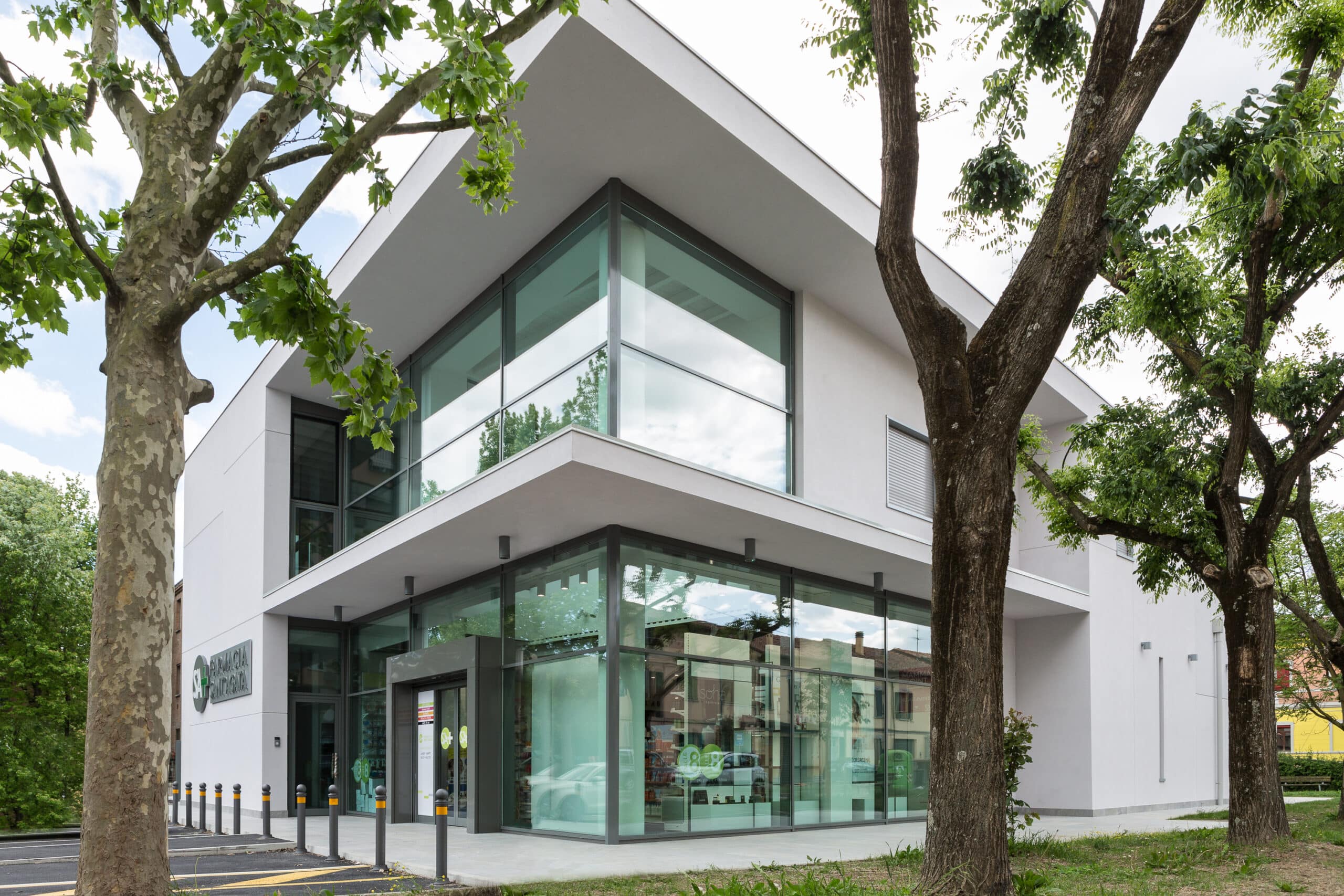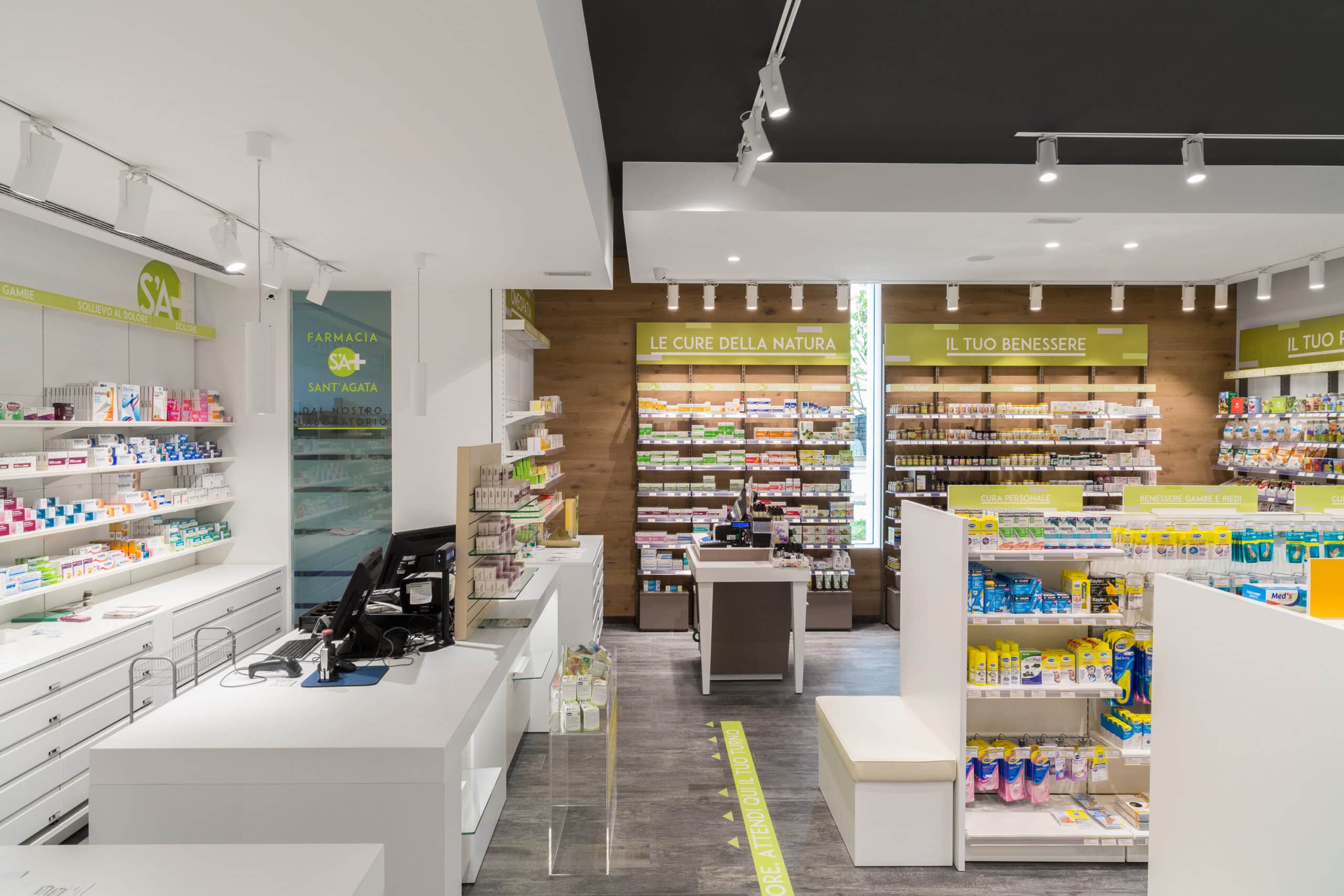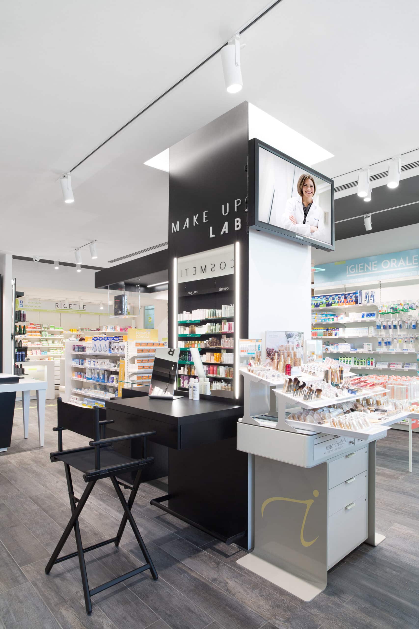 La comunicazione e gli arredi su misura, guardano ad un design ricercato ed internazionale; le vetrine caratterizzate dall’alternanza tra elementi luminosi, leggeri e scorci dello spazio vendita della farmacia, danno risalto alla grande facciata vetrata.