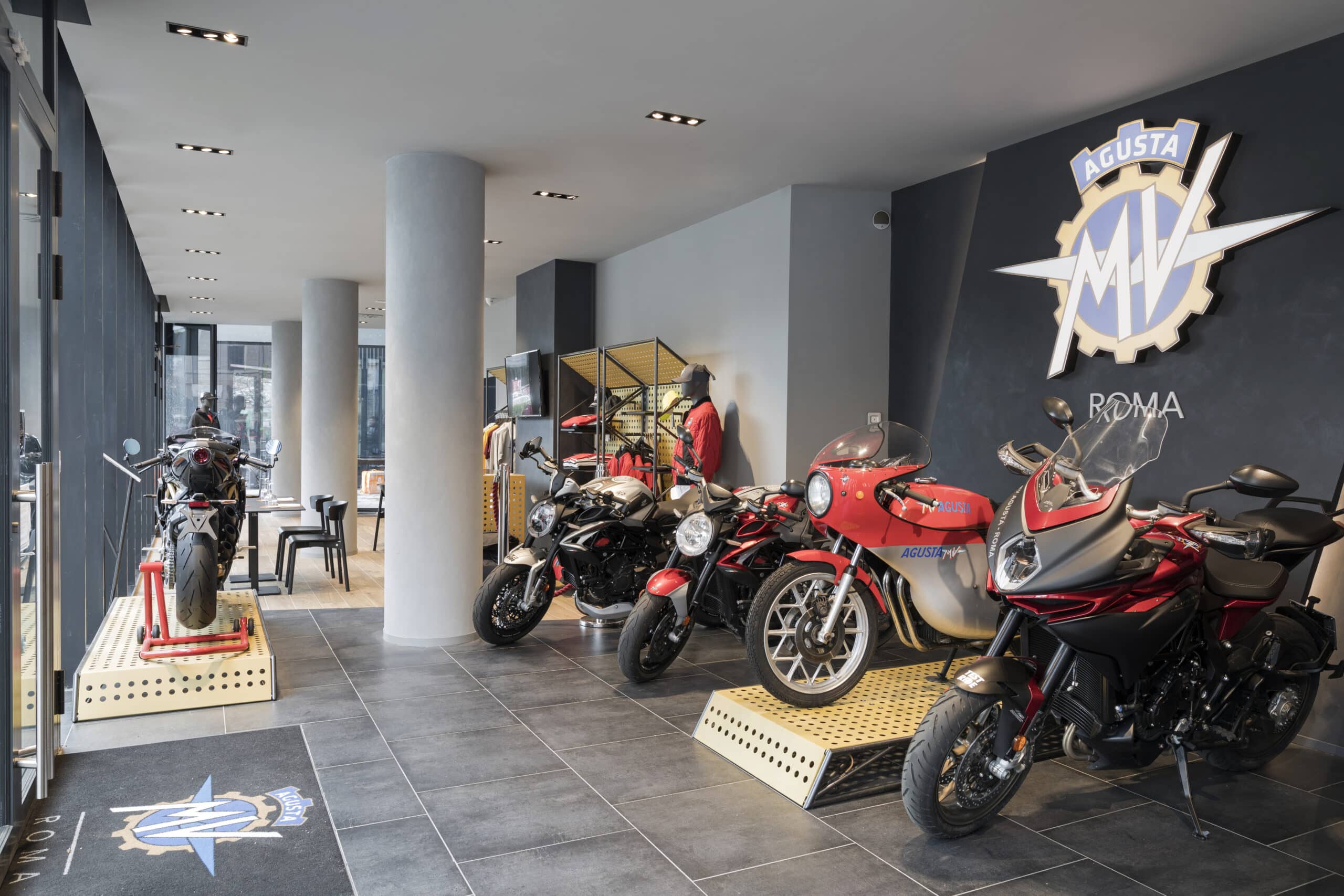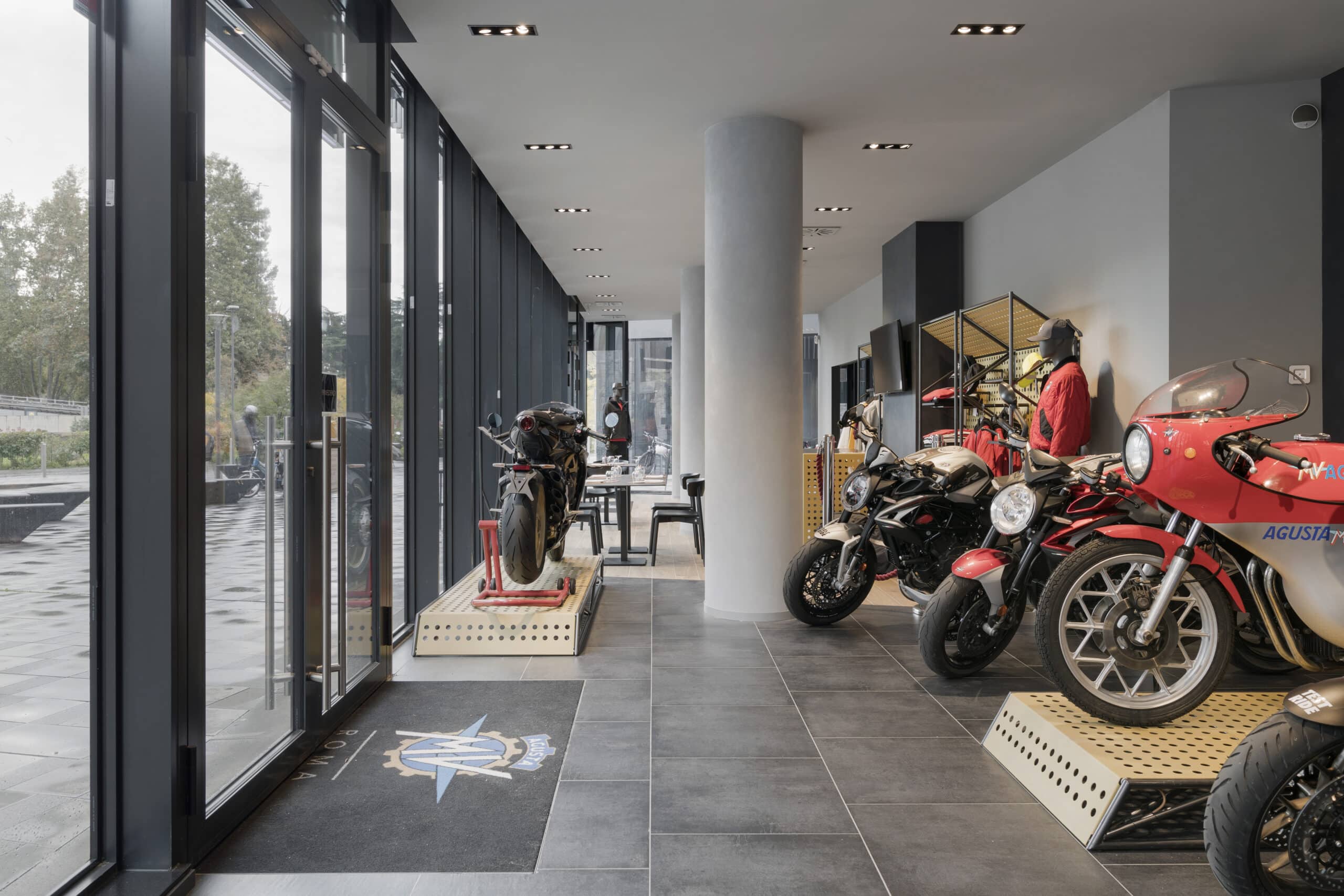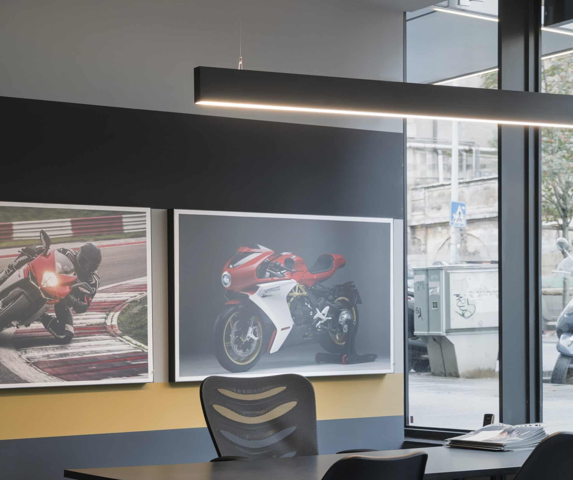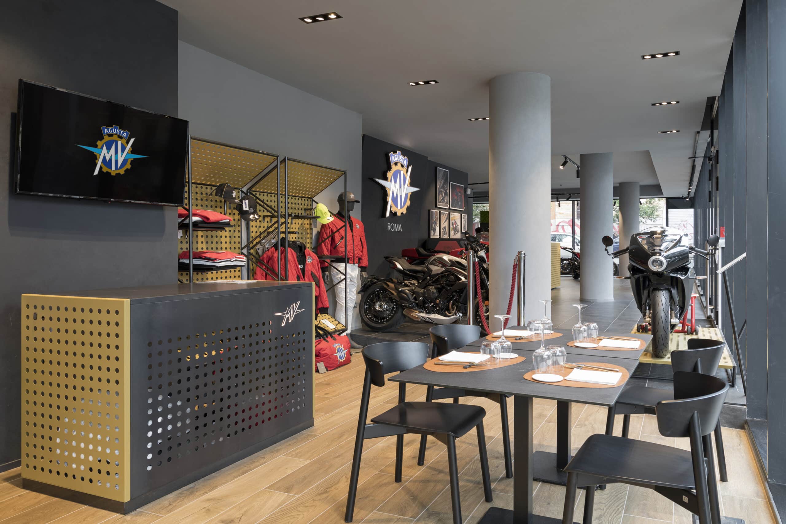L'illuminazione tiene conto dell'uno e dell'altro aspetto valorizzando le moto esposte e fornendo il la giusta illuminazione sui tavoli.