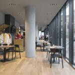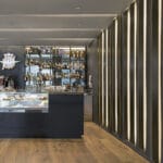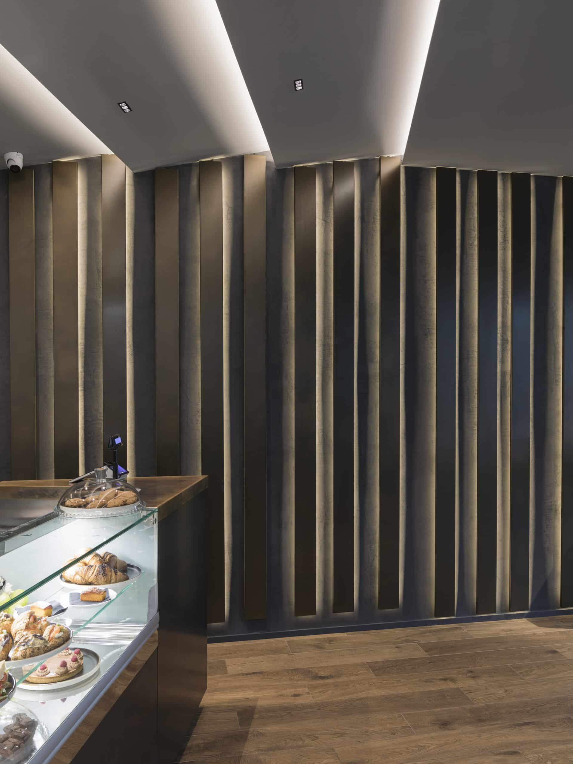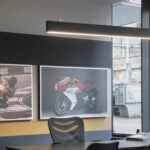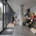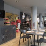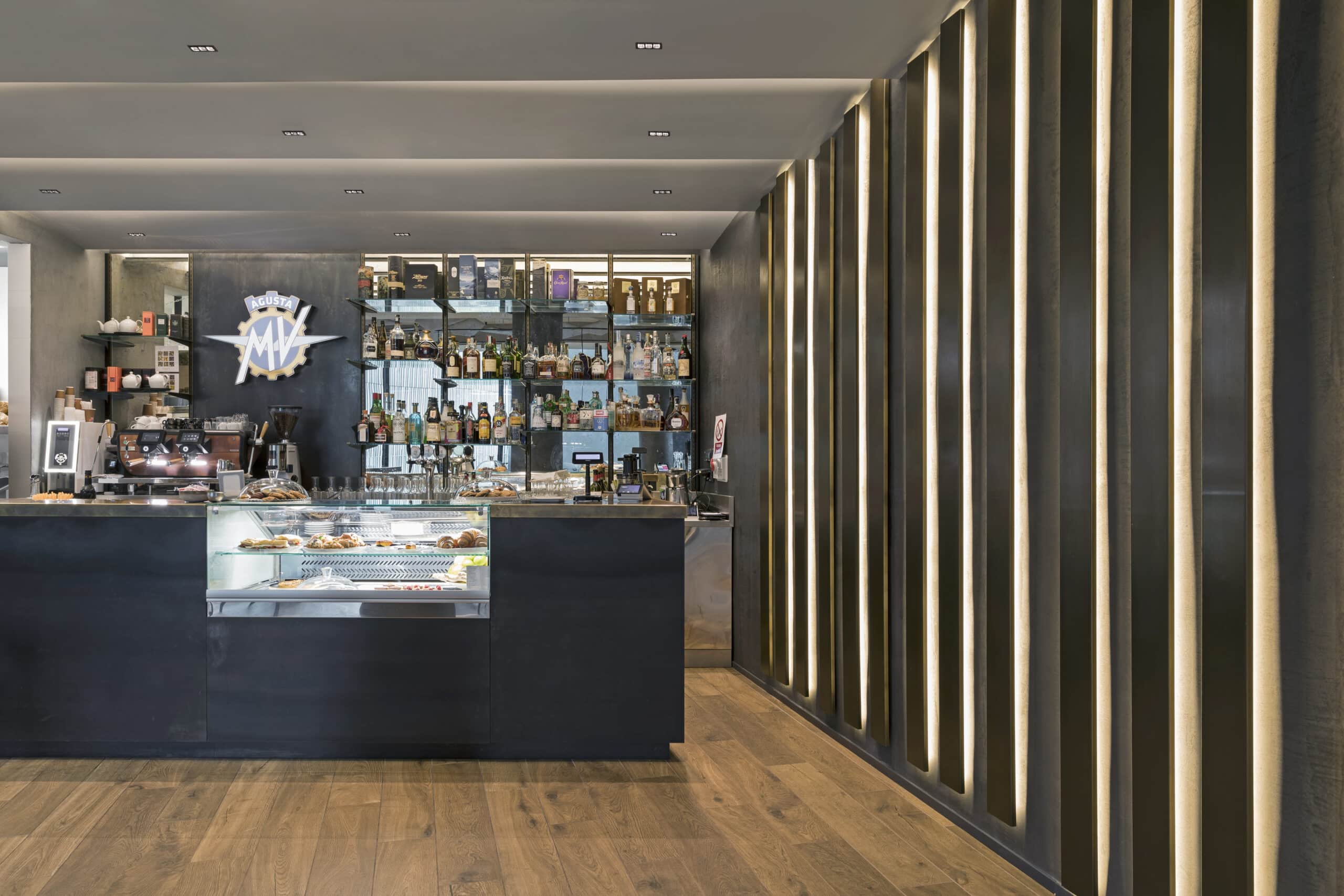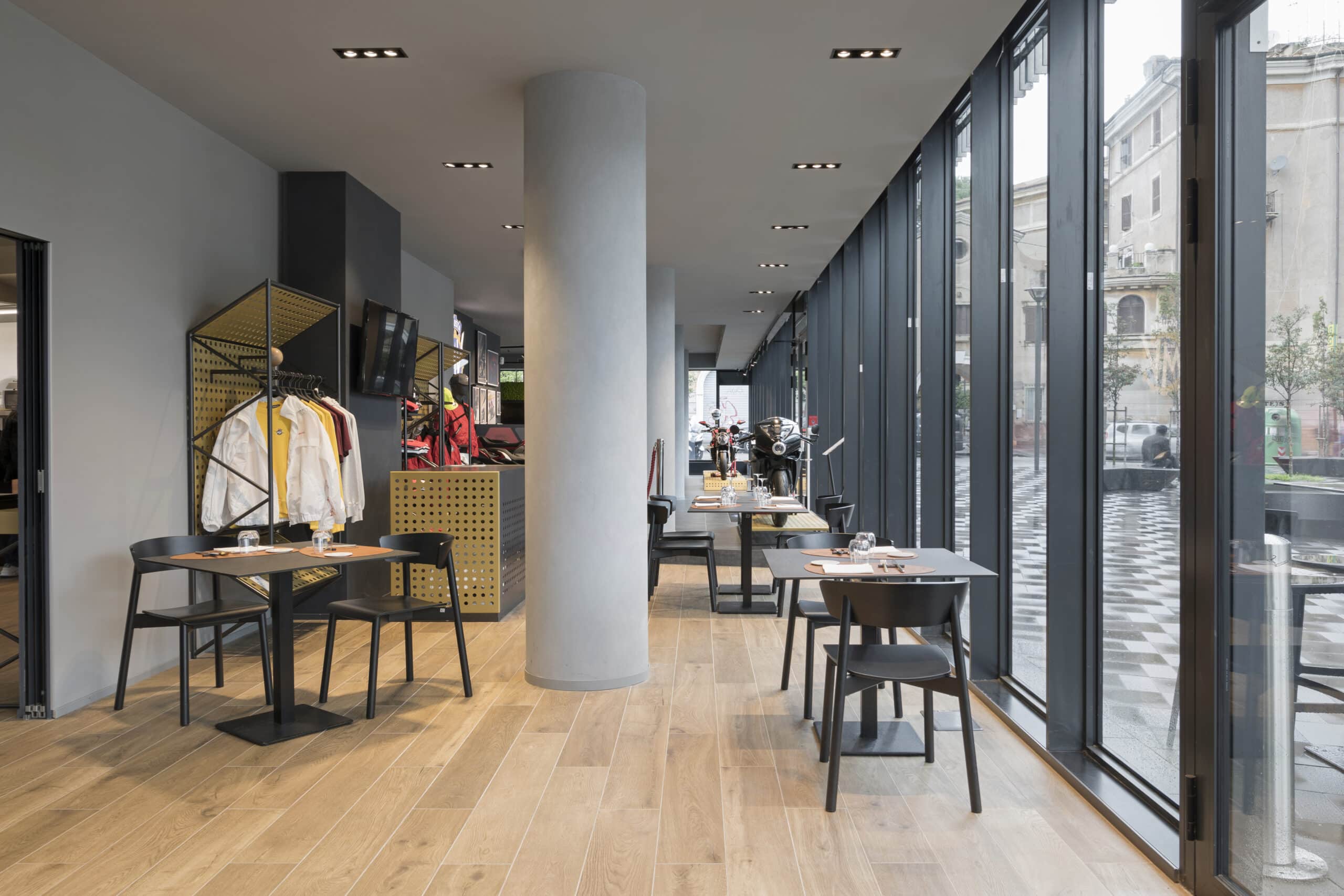 L'illuminazione tiene conto dell'uno e dell'altro aspetto valorizzando le moto esposte e fornendo il la giusta illuminazione sui tavoli.