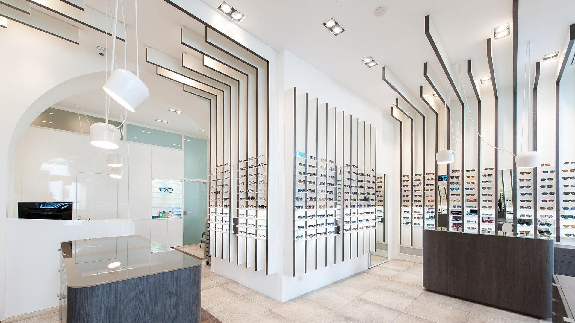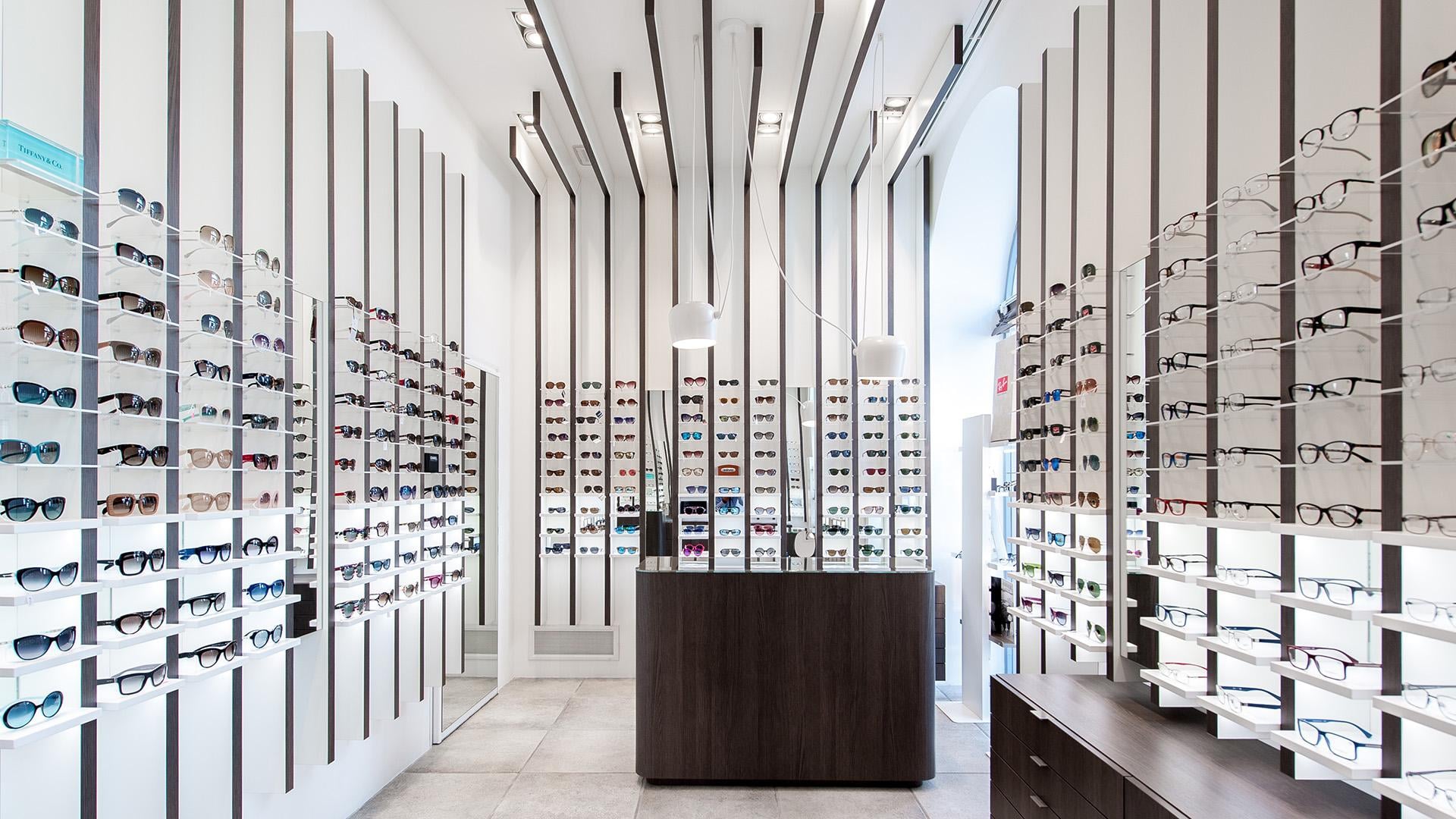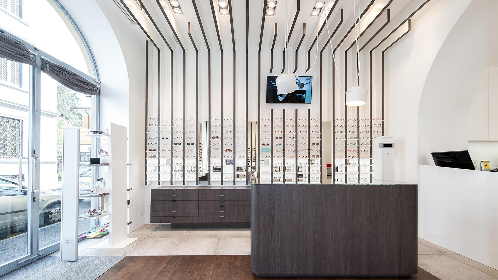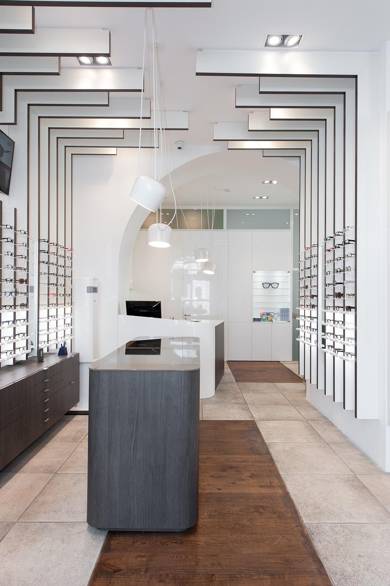 The design’s process challenge was to expose at least 500 glasses giving however to the customer the feel to be in a boutique and not in a department store. The store’s concept turns around the vertical blades that run from the floor, on the walls, to the ceiling expanding the perception of the space and becoming an elegant "structure" for showing glasses on light and backlit Plexiglas shelves. The final customer perception is not a confusing display of numerous articles, but a feeling of linearity and refinement in showing each pair of glasses.